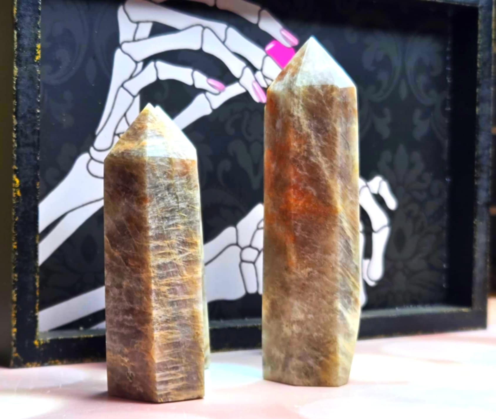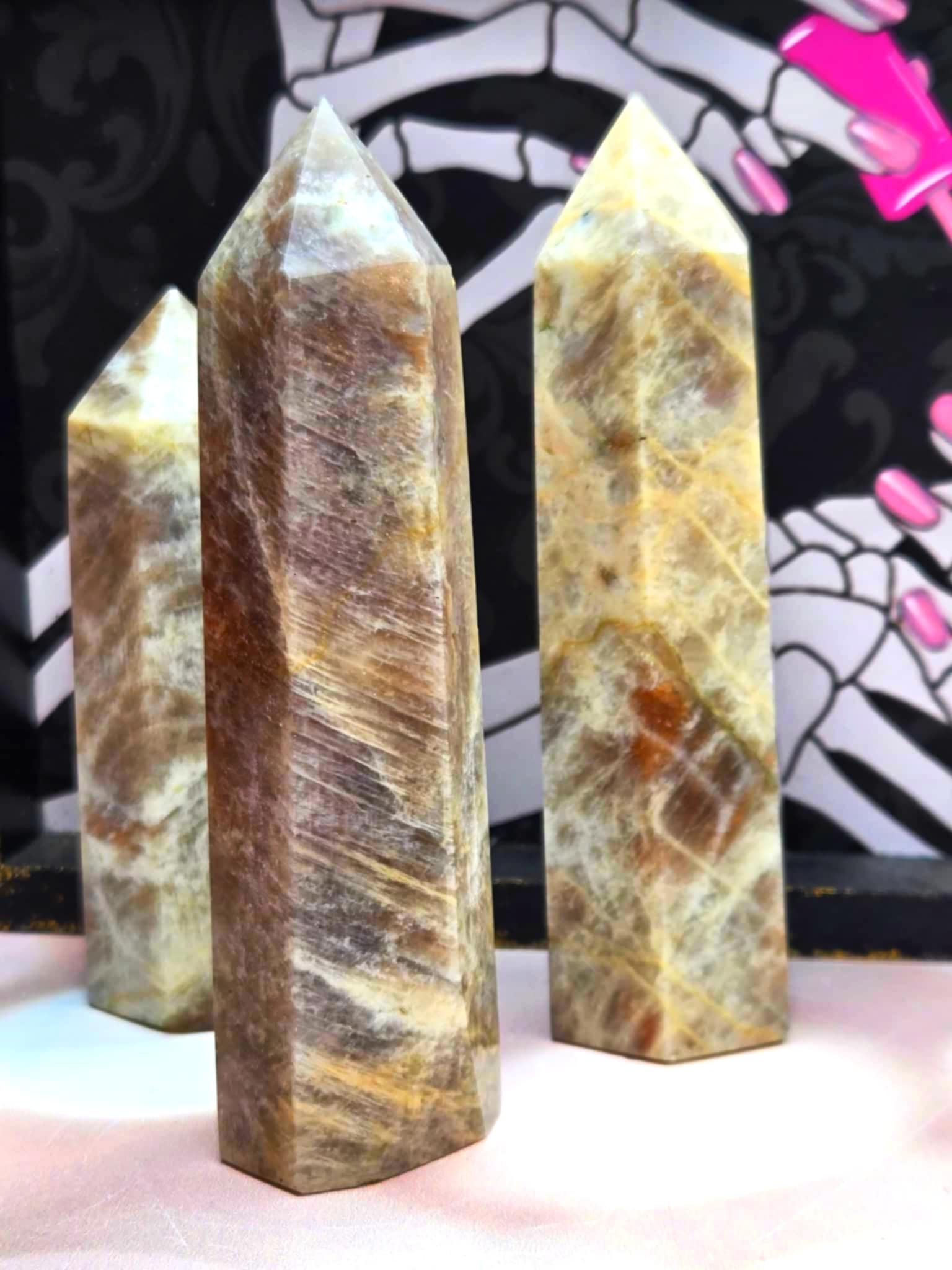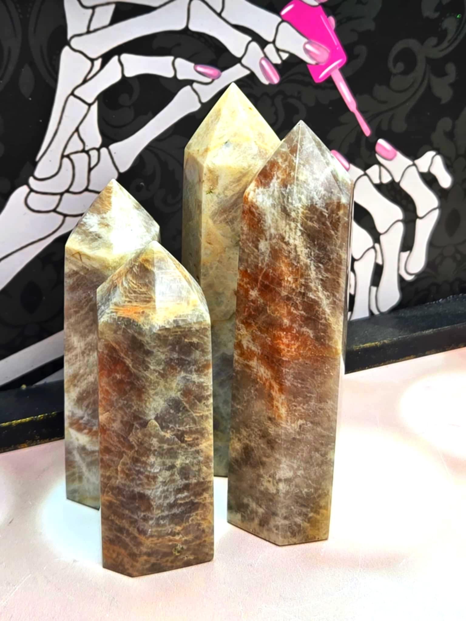 Yooo. Lemme tell you about Belomorite. Belomorite is a blend of Sunstone AND Moonstone, friends. How beautiful is that? Sunstone brings the energy of joy, positivity, happiness, motivation and success. Moonstone connects us to our intuition, our magic, our spirit, to hope, to seeing with new eyes. This stone is just everything. And these towers are beautiful with just the right amount of iridescence and flash.