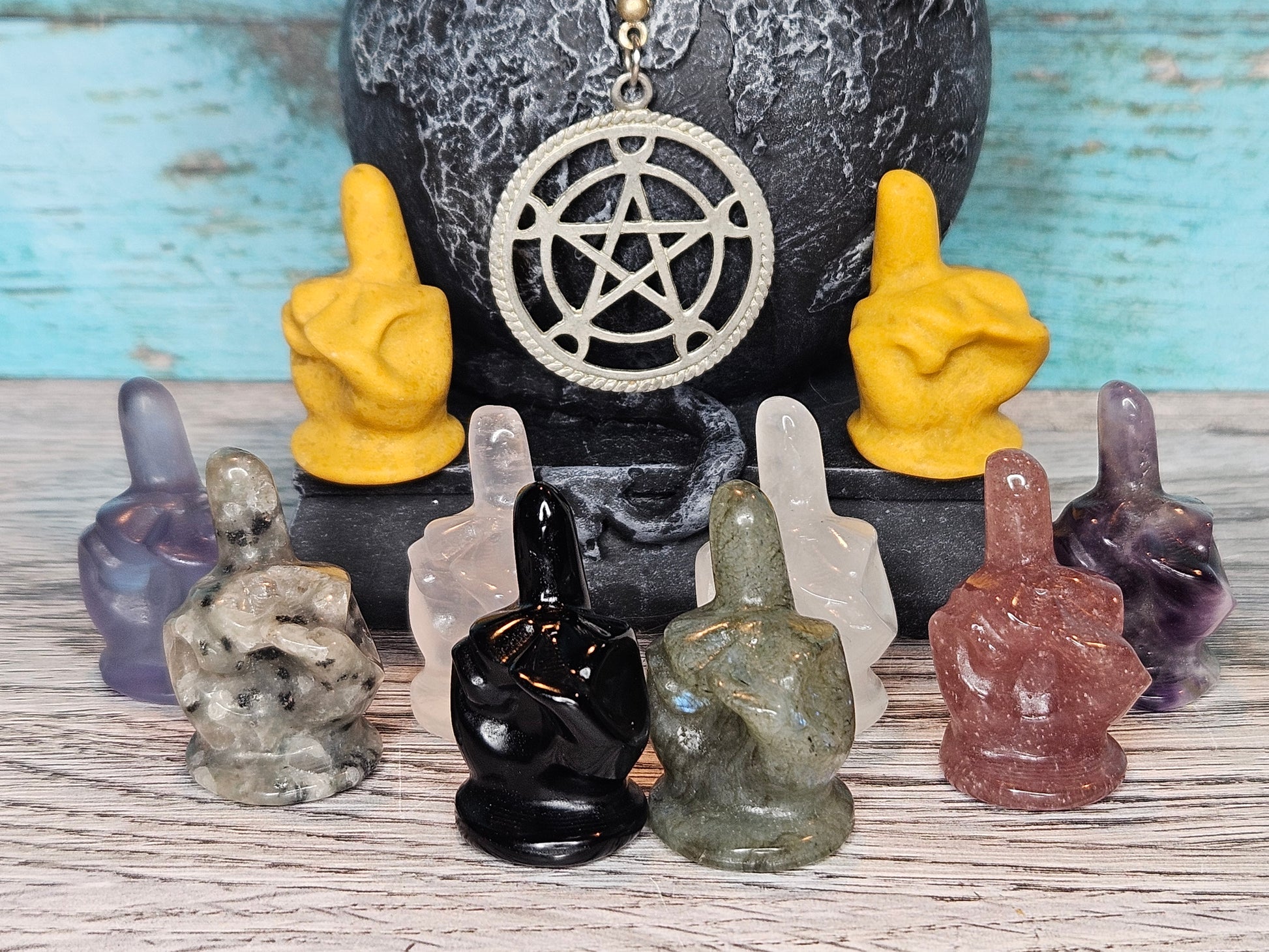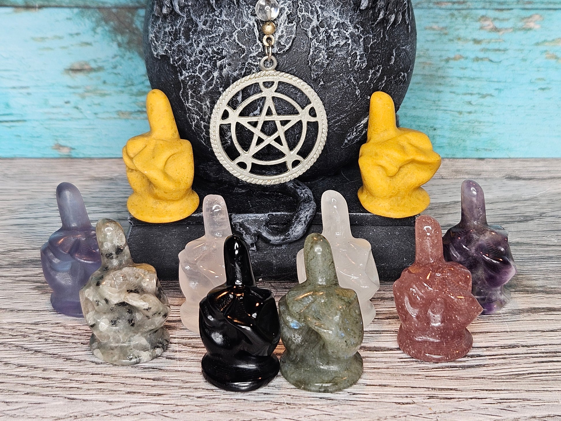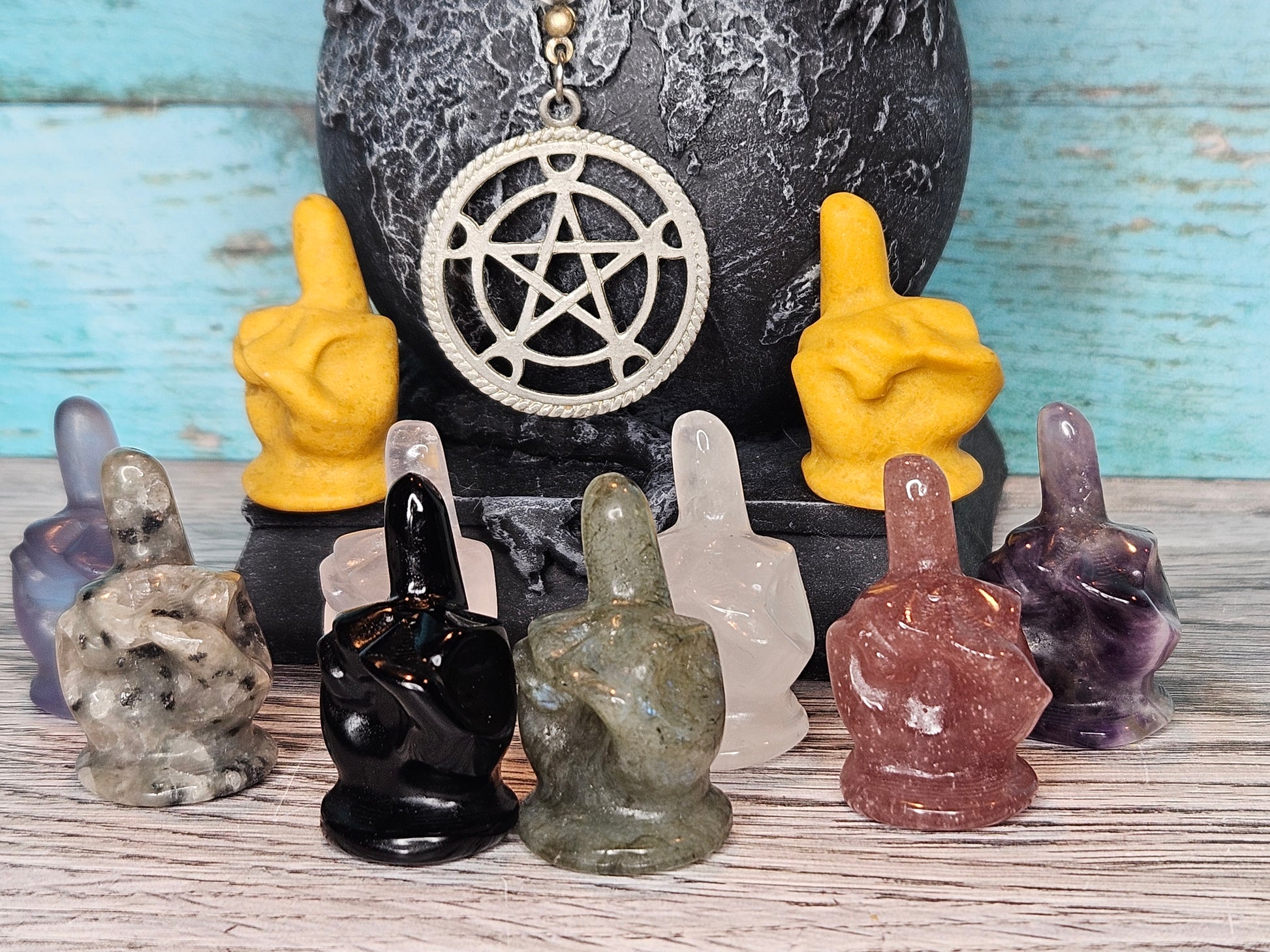 We found some fucks and we wanna give them to you. Lol. These tiny baby middle finger crystals will bring you a lot of joy and laughs but they’re also gonna bring you protection. Say “F-off” to bad energy with these little guys radiating their assertive energy into your spaces and your spellwork. Use them in protection work, hell, use them in baneful work if you want. It will add protection for you wherever it’s placed. Wear it in your bra and quietly know you’re able to give some eff you’s out to the world whenever you want lol. These are hilarious and fun little offerings to bring you a smile and to cover your back. These are very small so don’t be surprised by their size but even though they may be small they are mighty. They’re telling the bad energy to eff right off and honestly? We need more of that in our lives. For reals. Assorted, intuitively chosen.