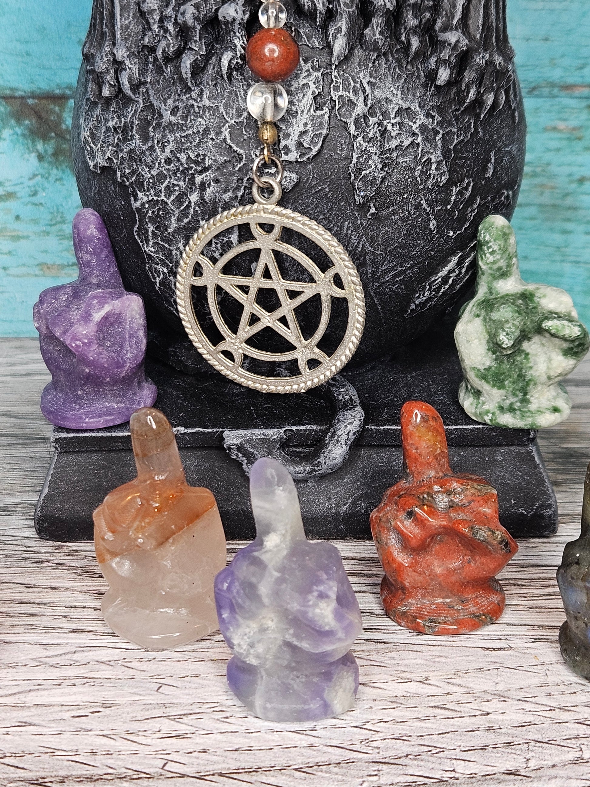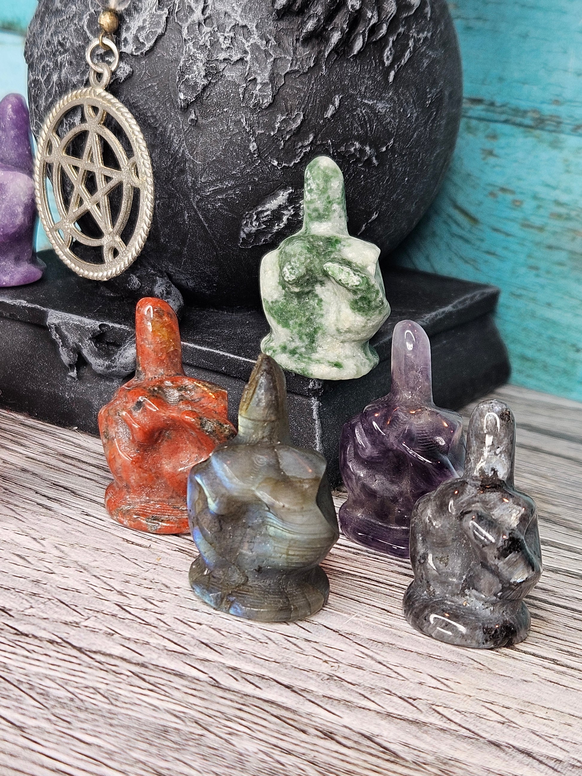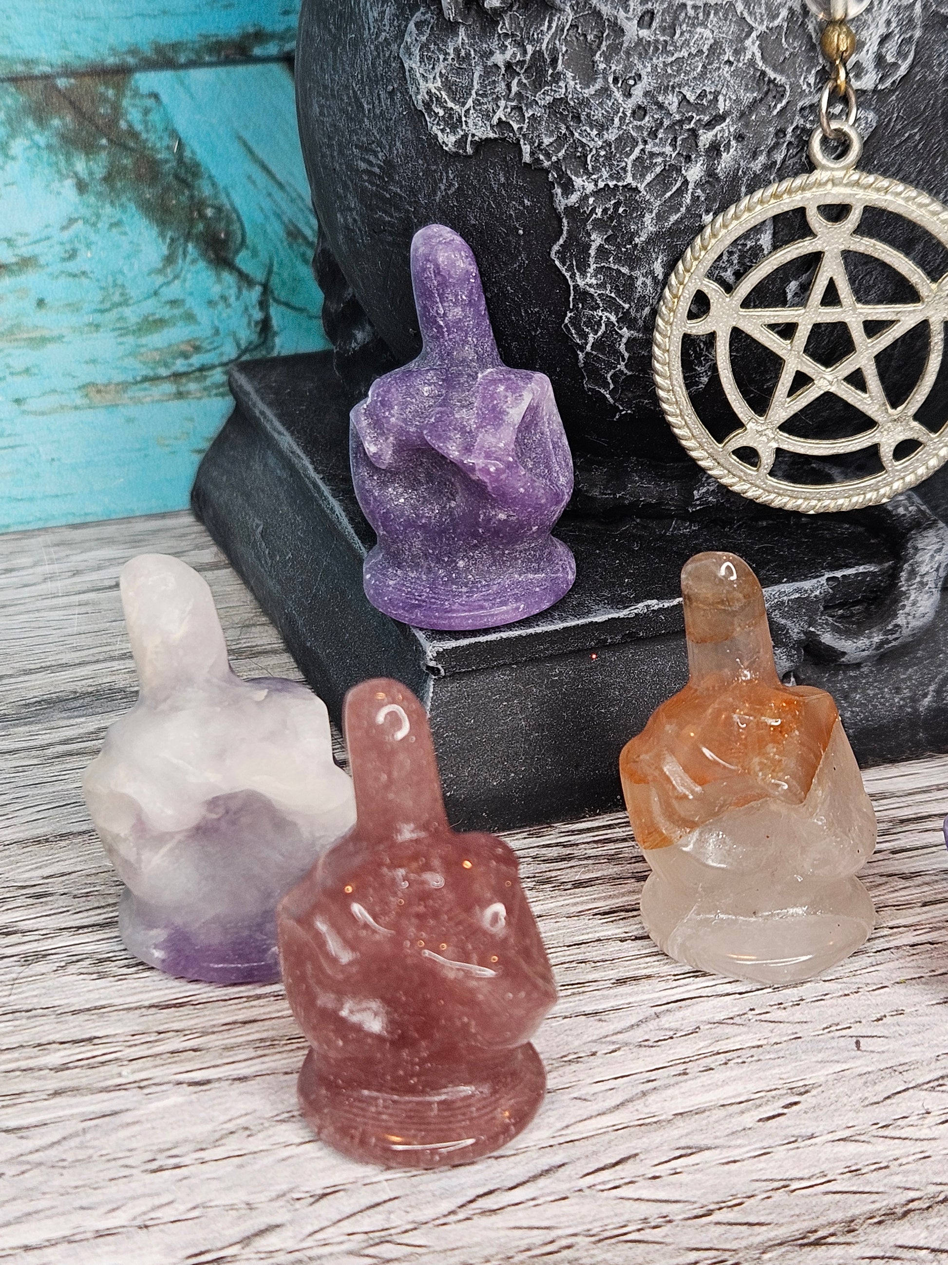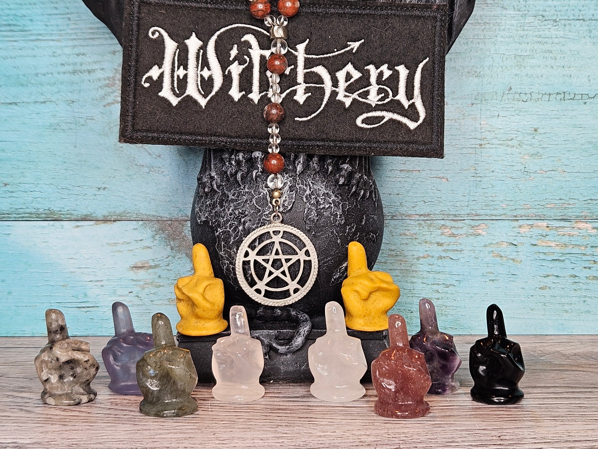 We found some fucks and we wanna give them to you. Lol. These tiny baby middle finger crystals will bring you a lot of joy and laughs but they’re also gonna bring you protection. Say “F-off” to bad energy with these little guys radiating their assertive energy into your spaces and your spellwork. Use them in protection work, hell, use them in baneful work if you want. It will add protection for you wherever it’s placed. Wear it in your bra and quietly know you’re able to give some eff you’s out to the world whenever you want lol. These are hilarious and fun little offerings to bring you a smile and to cover your back. These are very small so don’t be surprised by their size but even though they may be small they are mighty. They’re telling the bad energy to eff right off and honestly? We need more of that in our lives. For reals. Assorted, intuitively chosen.