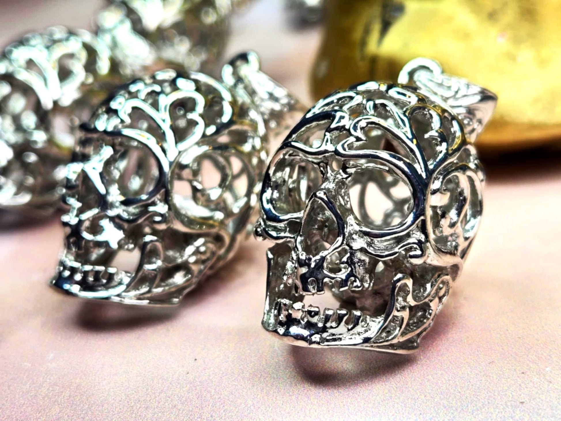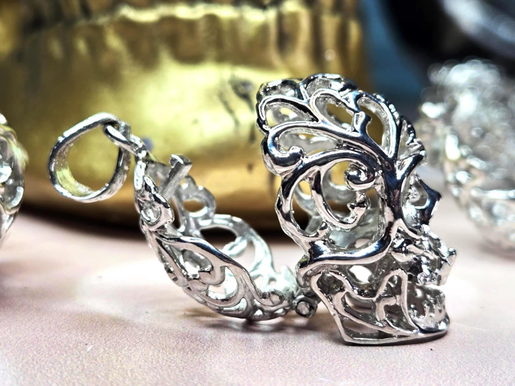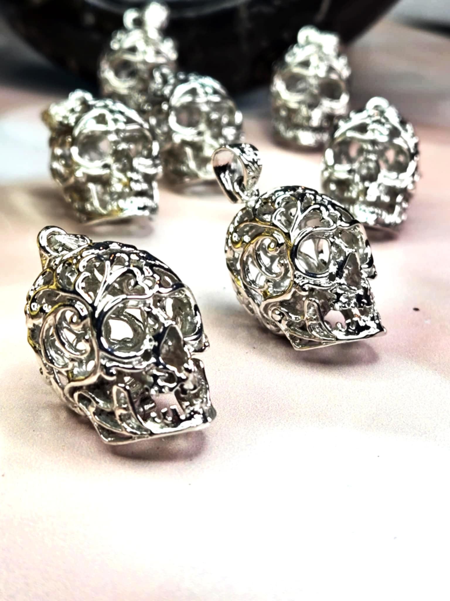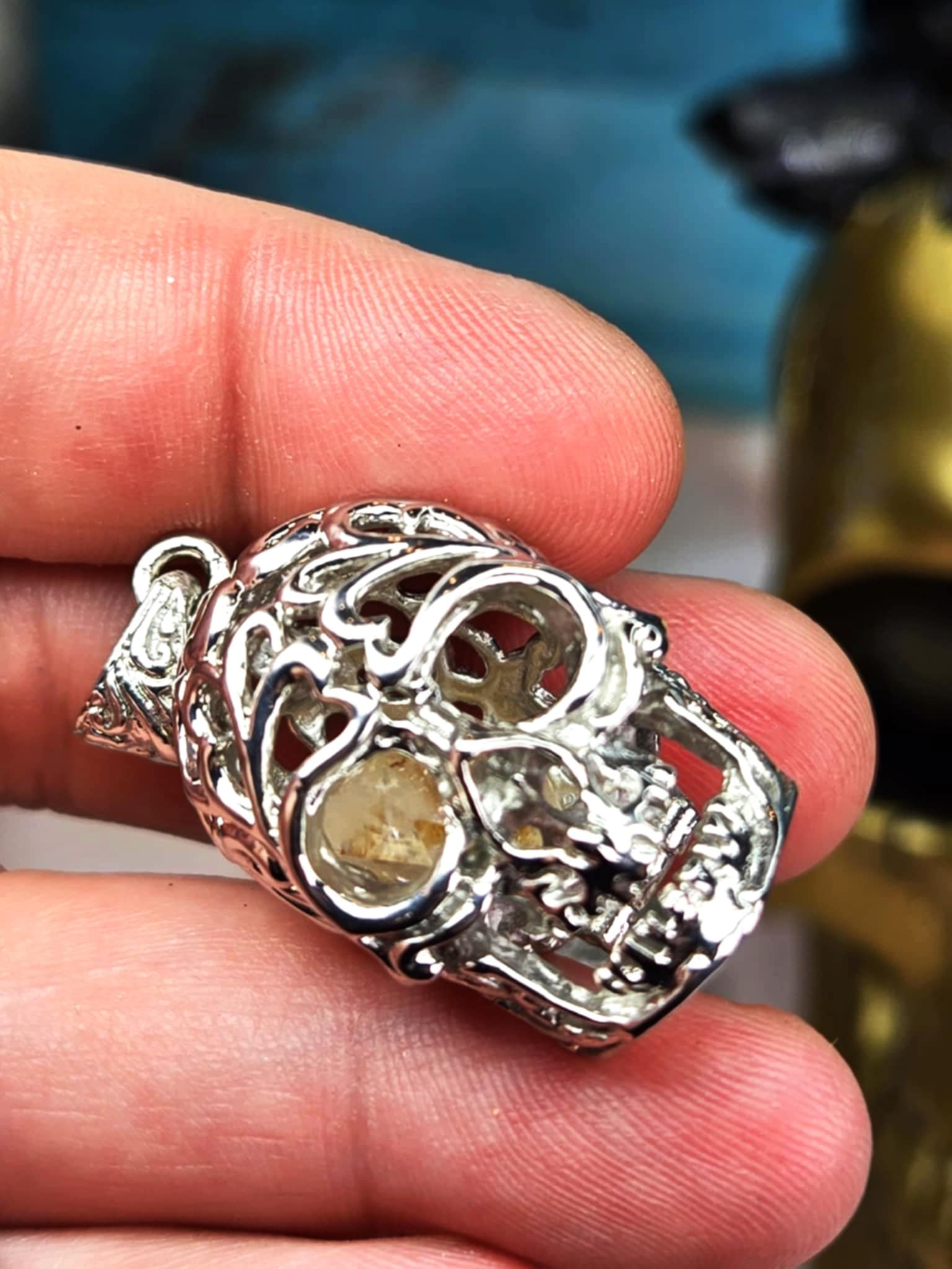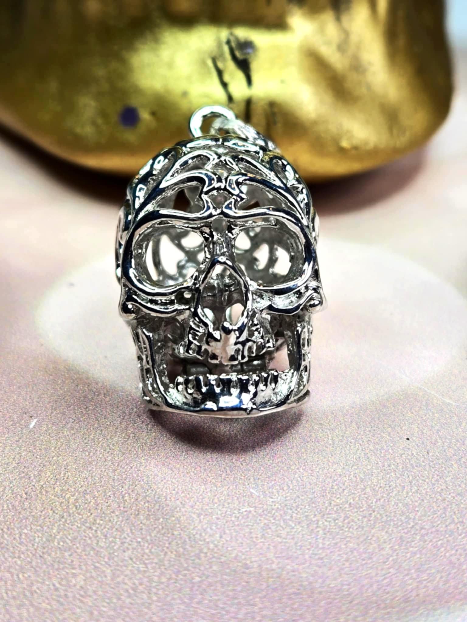 This metal skull pendant is probably the coolest necklace I've ever seen. It is a metal skull decorated with filigree but the best part? *It Opens!!* For real!! You can carry a small crystal, a petition rolled into a scroll, anything you can think of and it will be encased in that Protection Skull. A spell you can wear wherever you want to keep magical protection with you.