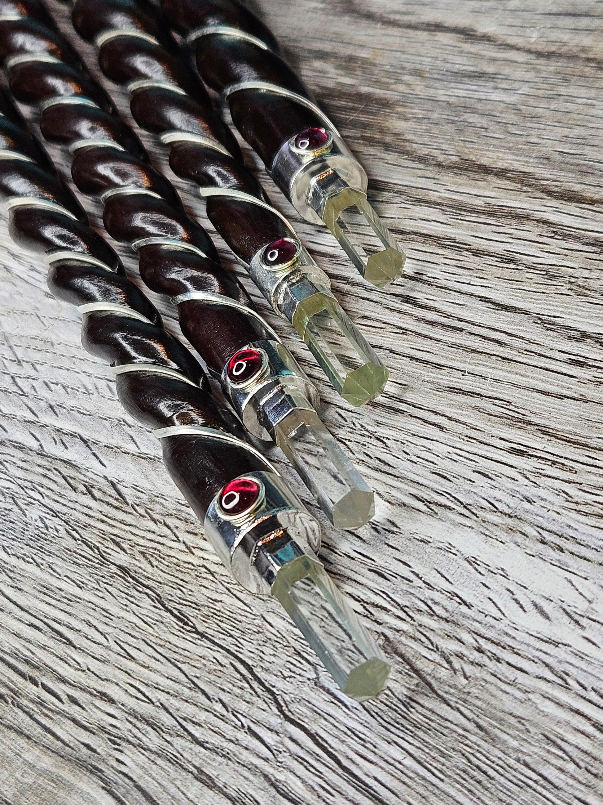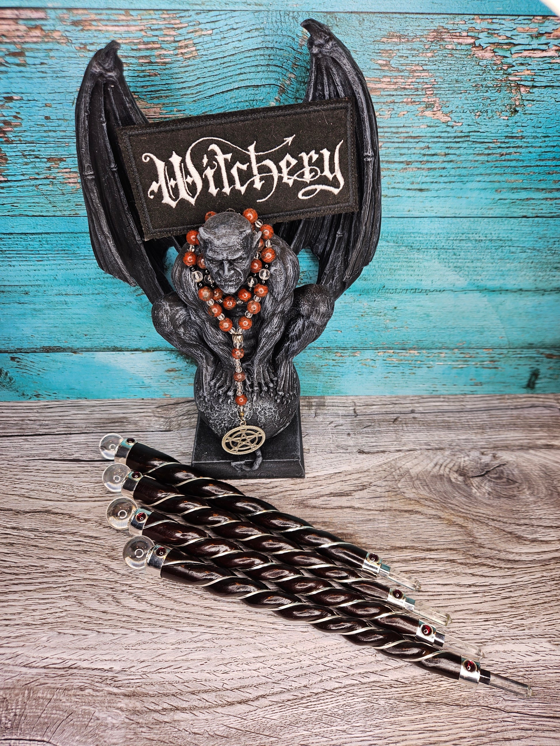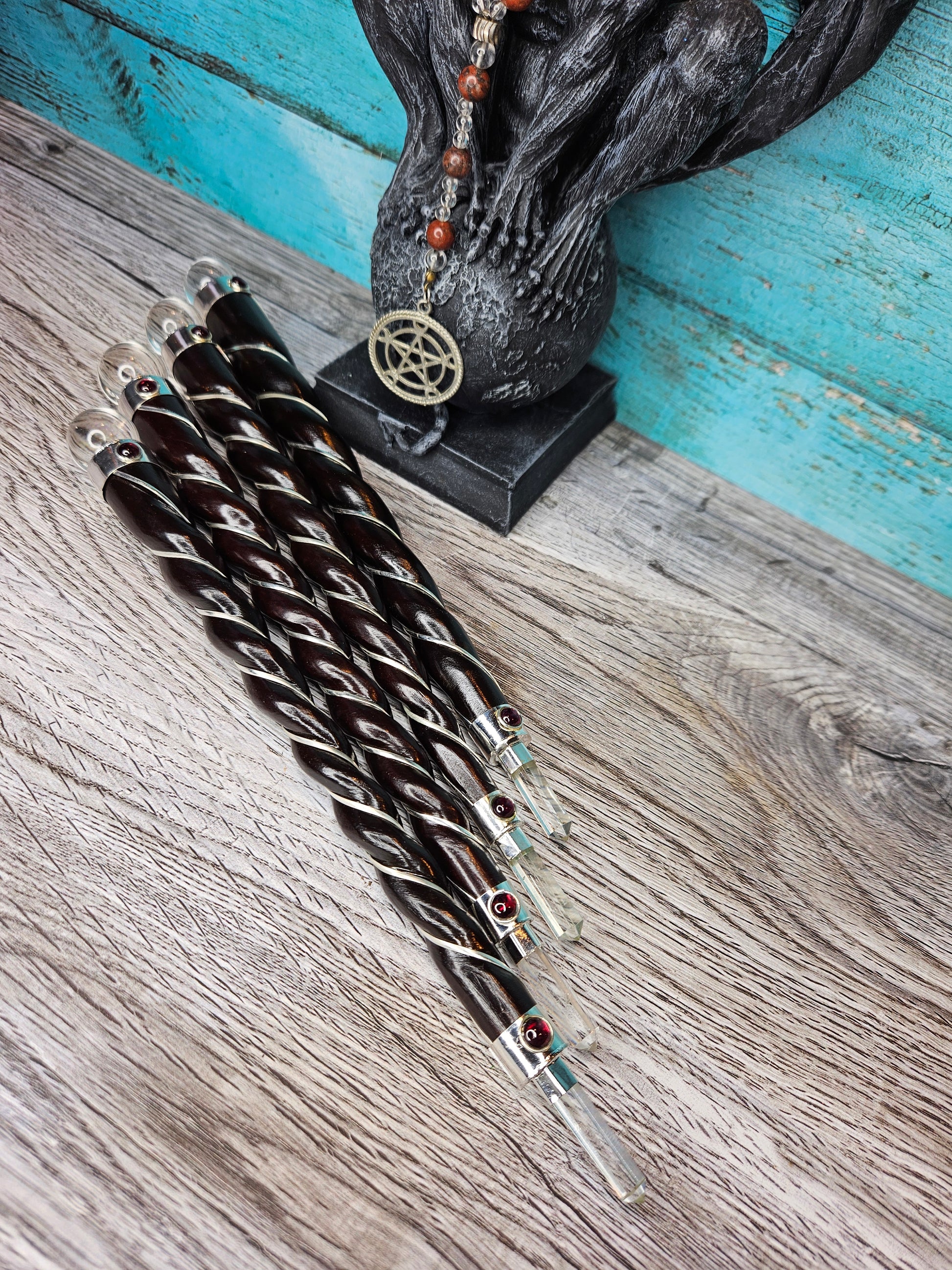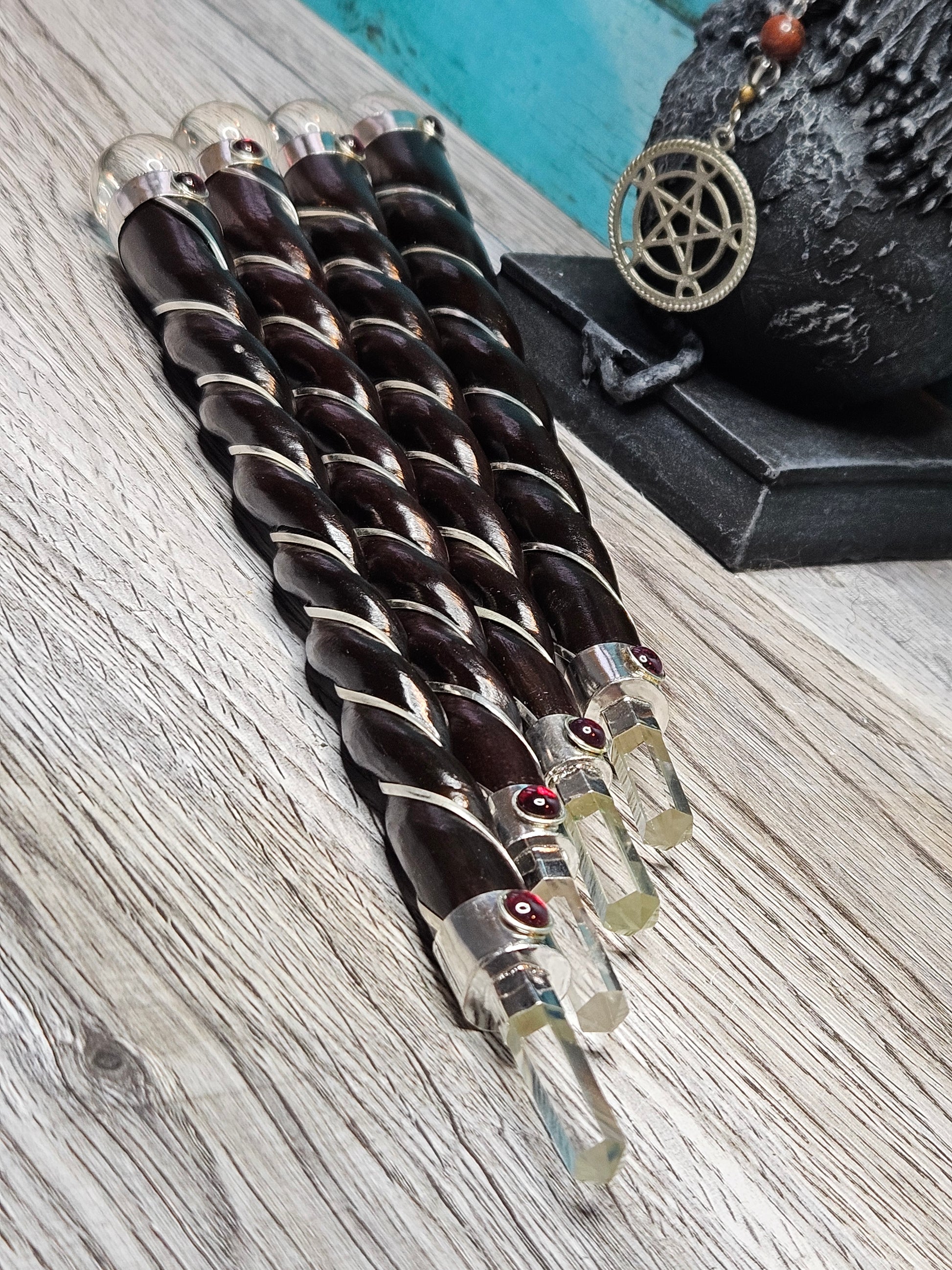 These twisted wooden vibes are topped with a clear “crystal” ball and decorated with little red stones. They also have quartz tips to direct the energy that you want to channel. To add to their power, they are laced with beautiful silver plated metal all the way down their stunning twists and turns. They are such a fantastic example of the melding of elements into one perfect piece. Metal and silver are highly protective, the ball at the top will hold your intention and send it through the wand via the wood and metal to direct it wherever you’d like it to go. Uses for this wand include but are not limited to: casting circles (especially good with the protection spell added to them), drawing sigils in your spaces, blessing your entire aura with protection, directing protection energy to your car, your kids, your pets and your home. You can tap it on your spells and jars to add protection to them. The possibilities are endless and these babies create a vortex with their twists and turns which opens a portal of protection to them. Functional and fabulous. These are witchy AF.