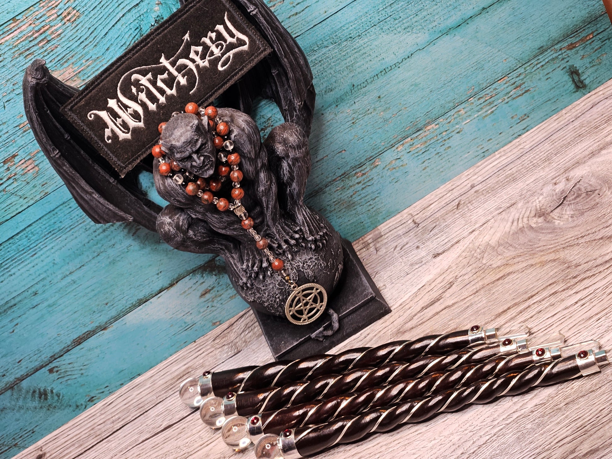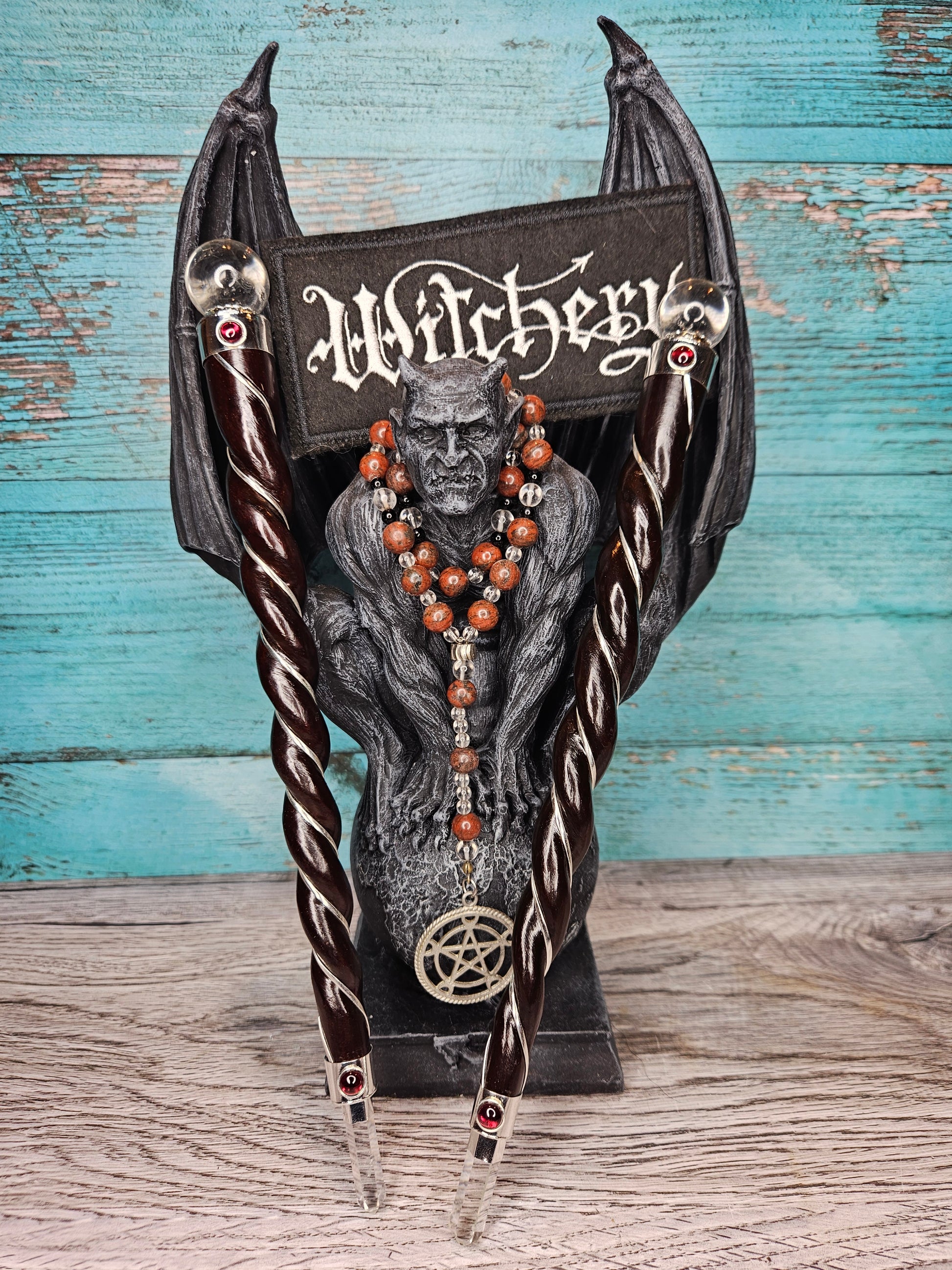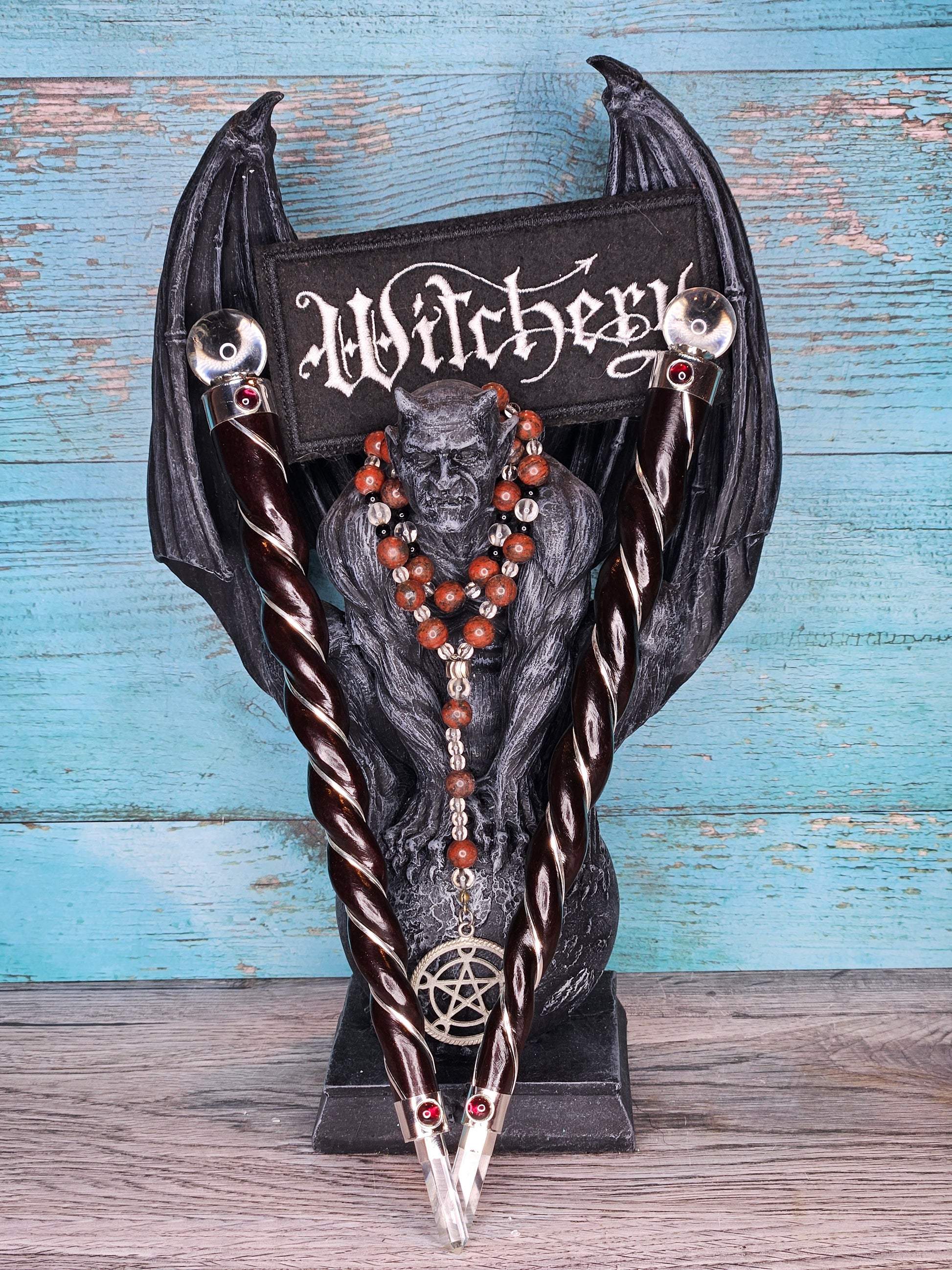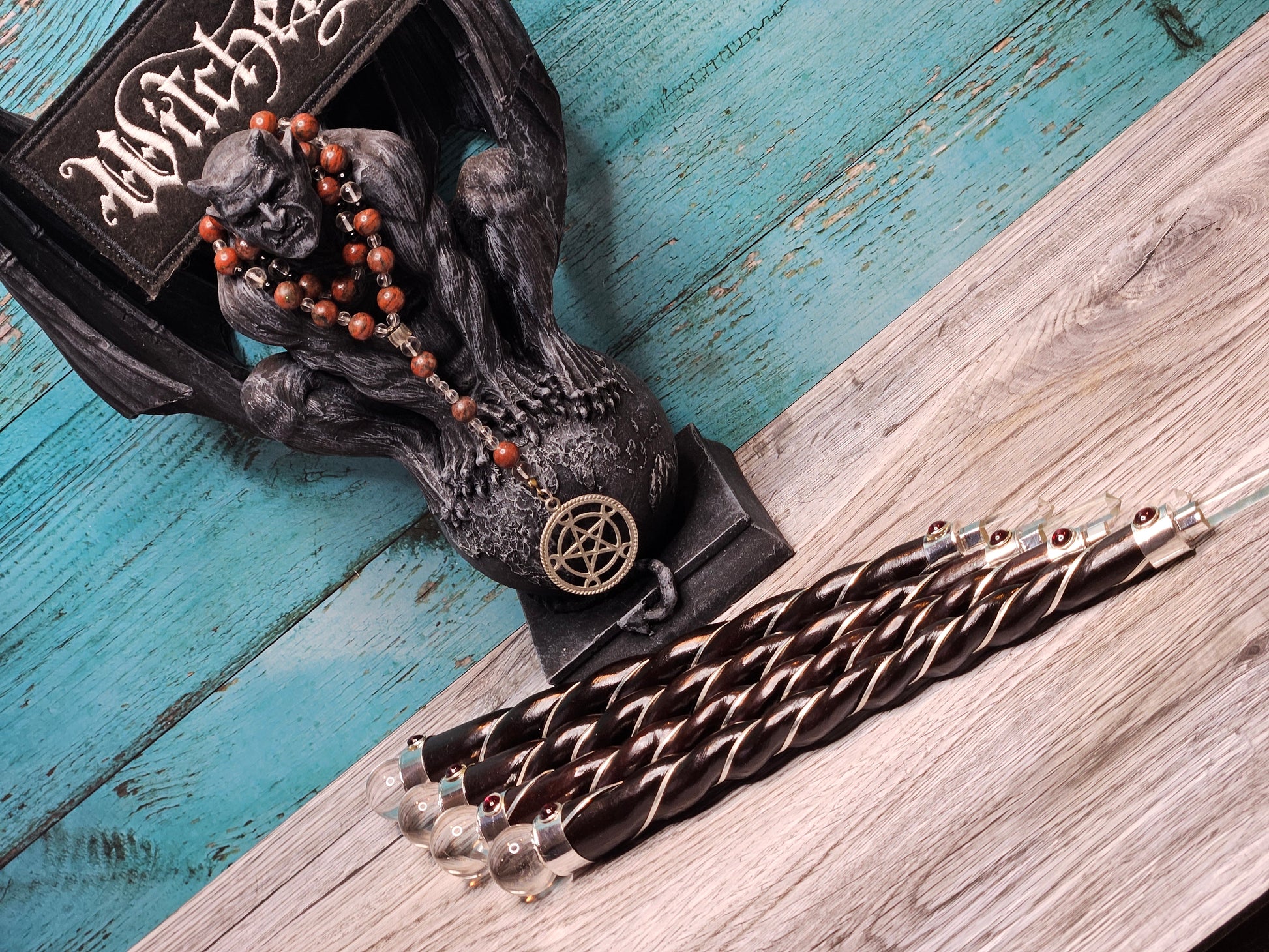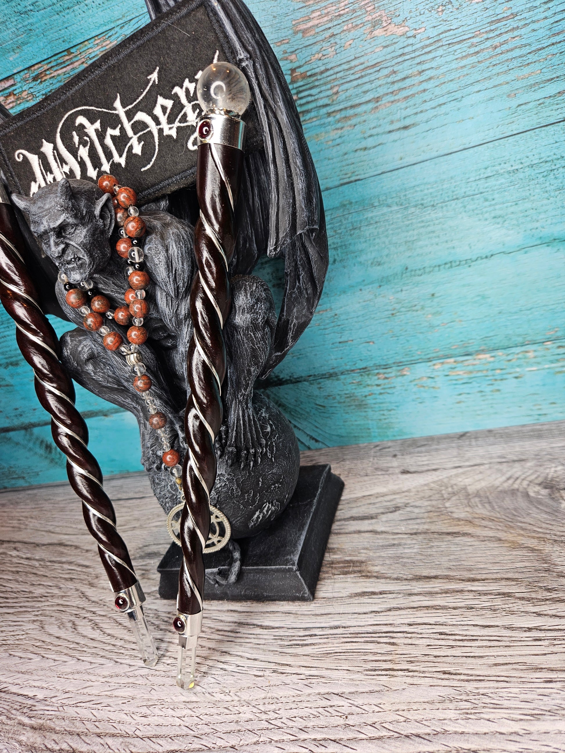 These twisted wooden vibes are topped with a clear “crystal” ball and decorated with little red stones. They also have quartz tips to direct the energy that you want to channel. To add to their power, they are laced with beautiful silver plated metal all the way down their stunning twists and turns. They are such a fantastic example of the melding of elements into one perfect piece. Metal and silver are highly protective, the ball at the top will hold your intention and send it through the wand via the wood and metal to direct it wherever you’d like it to go. Uses for this wand include but are not limited to: casting circles (especially good with the protection spell added to them), drawing sigils in your spaces, blessing your entire aura with protection, directing protection energy to your car, your kids, your pets and your home. You can tap it on your spells and jars to add protection to them. The possibilities are endless and these babies create a vortex with their twists and turns which opens a portal of protection to them. Functional and fabulous. These are witchy AF.