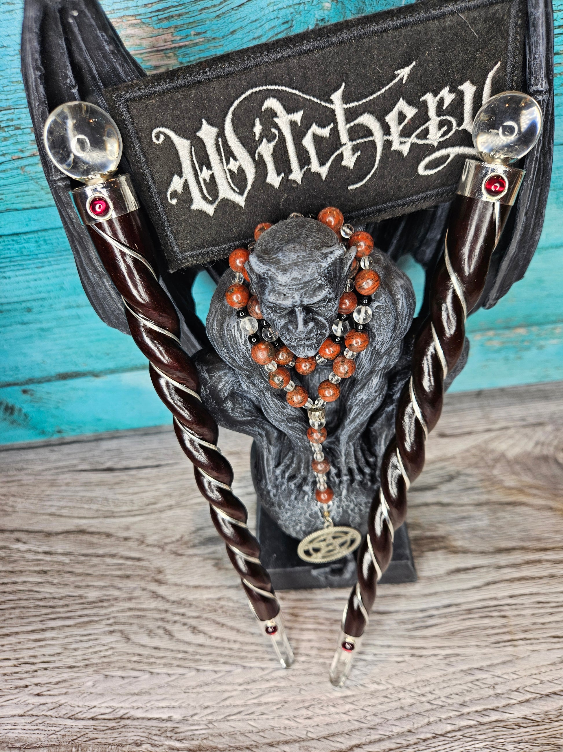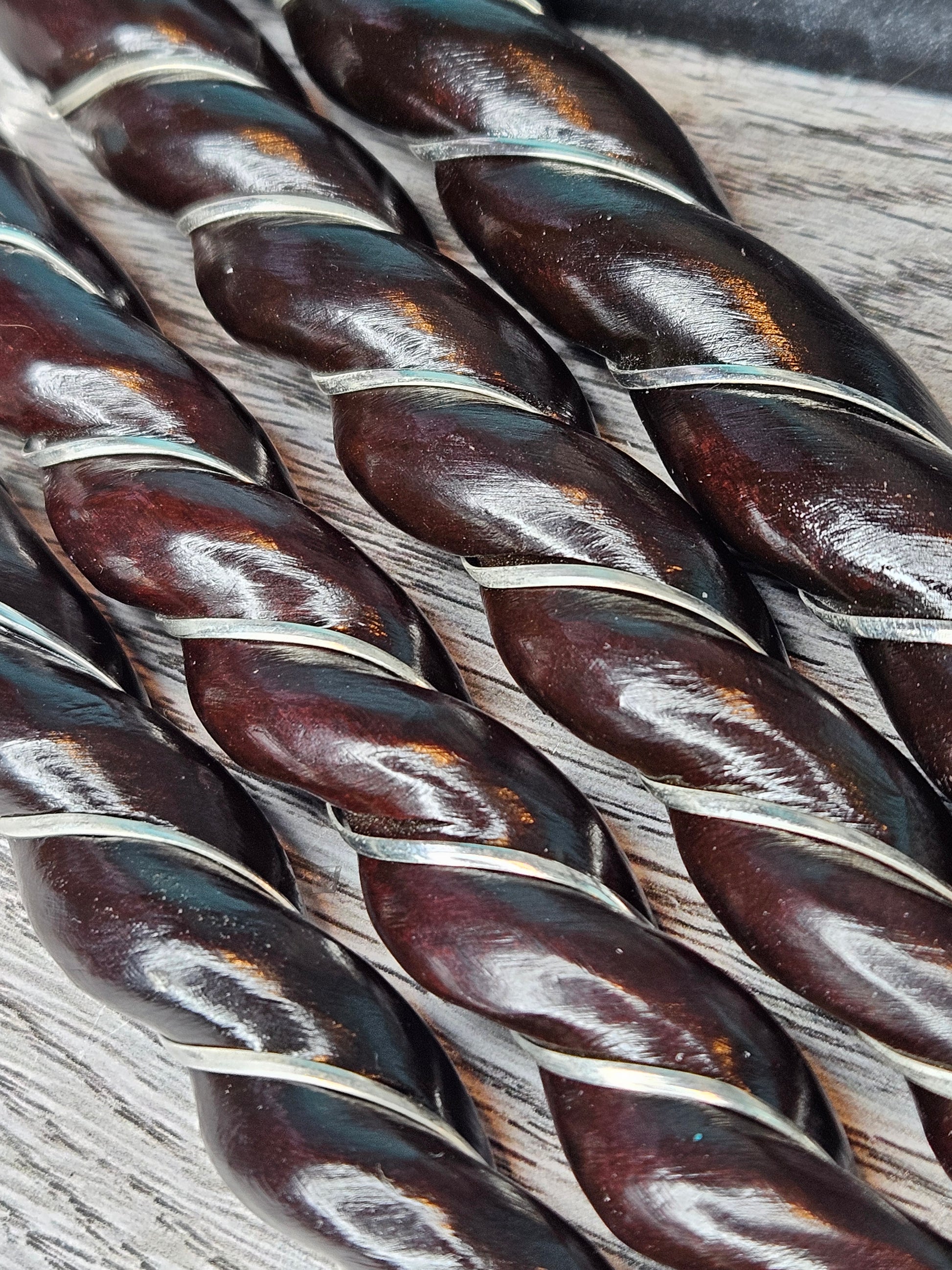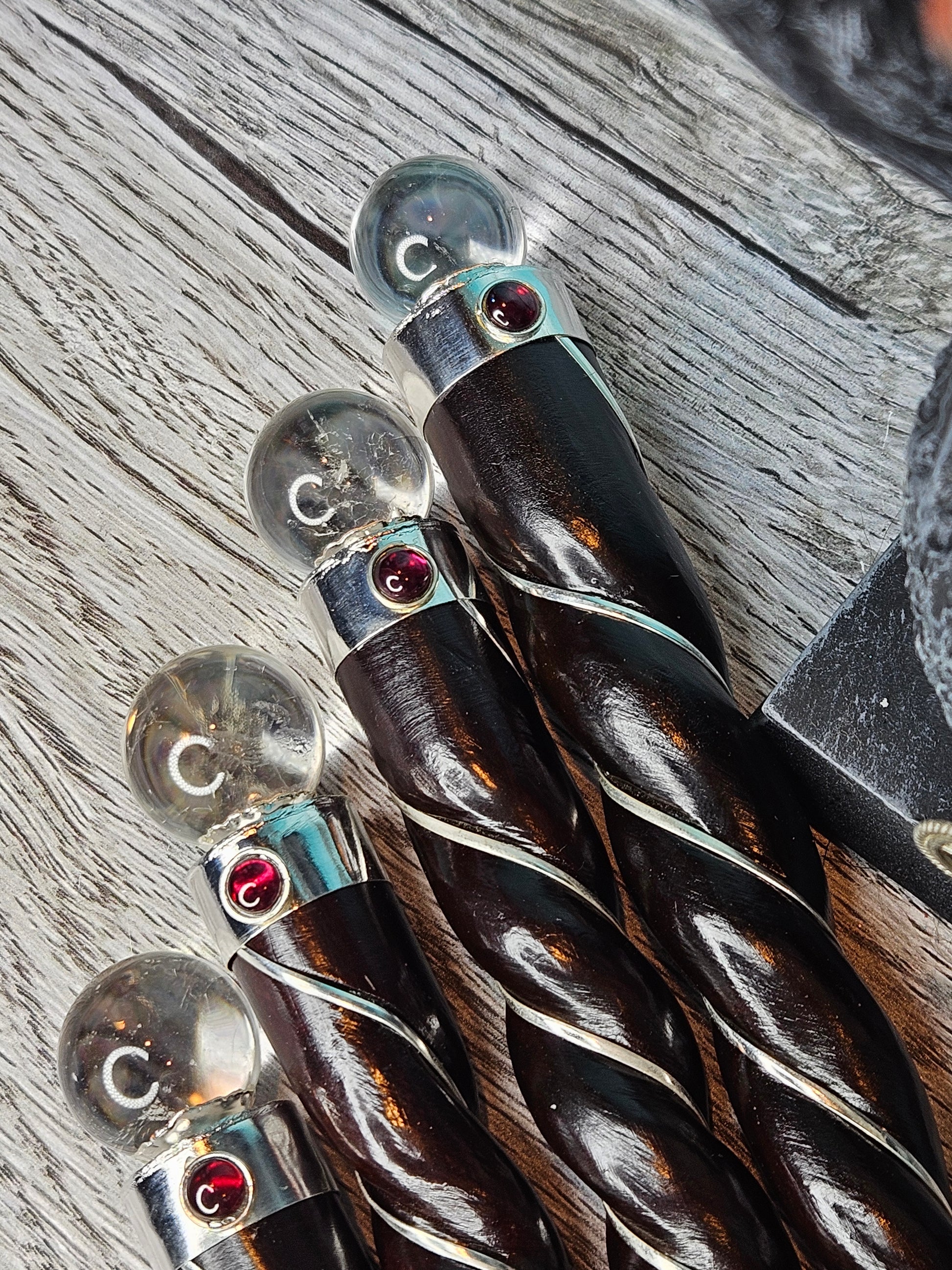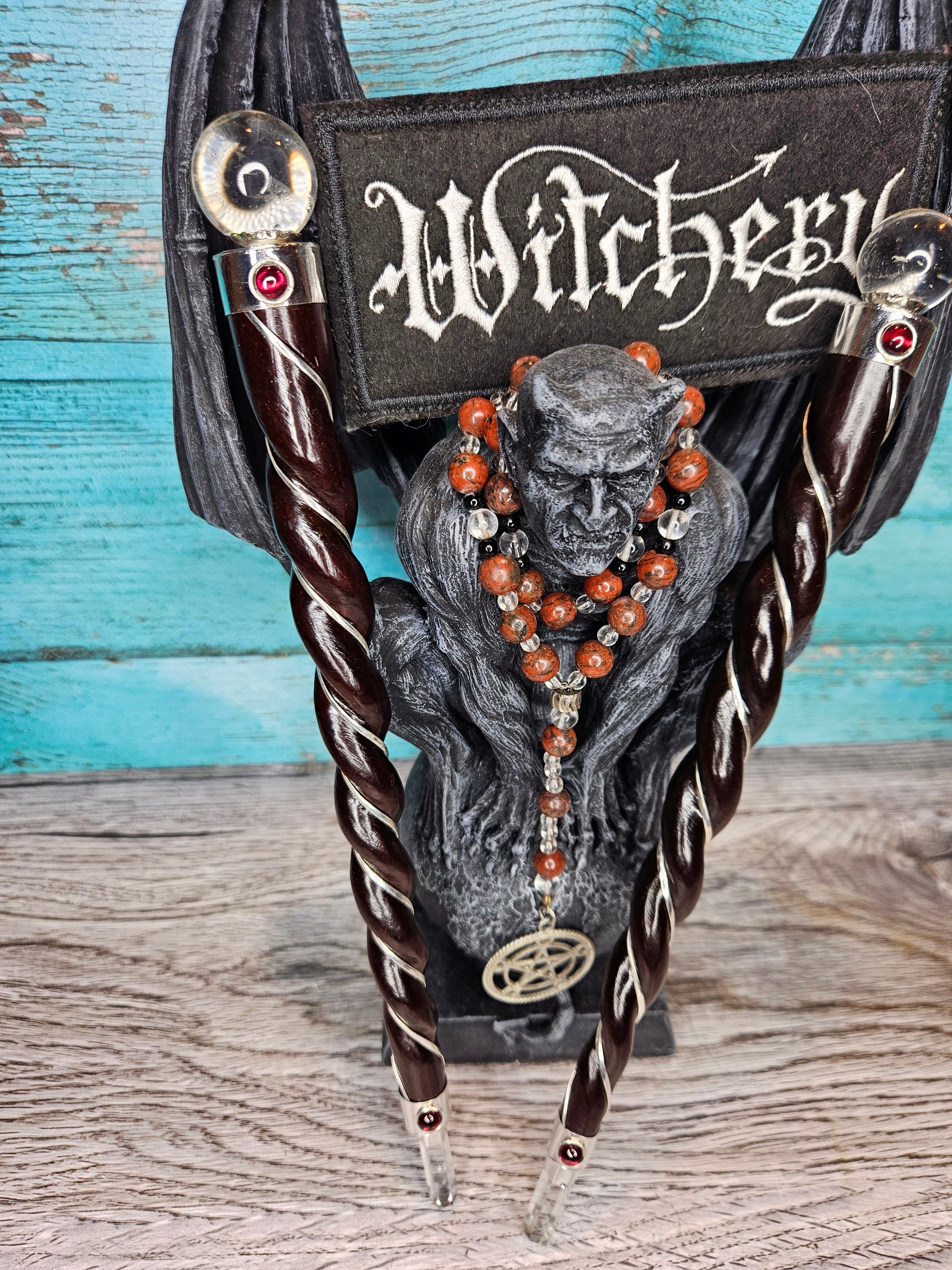 These twisted wooden vibes are topped with a clear “crystal” ball and decorated with little red stones. They also have quartz tips to direct the energy that you want to channel. To add to their power, they are laced with beautiful silver plated metal all the way down their stunning twists and turns. They are such a fantastic example of the melding of elements into one perfect piece. Metal and silver are highly protective, the ball at the top will hold your intention and send it through the wand via the wood and metal to direct it wherever you’d like it to go. Uses for this wand include but are not limited to: casting circles (especially good with the protection spell added to them), drawing sigils in your spaces, blessing your entire aura with protection, directing protection energy to your car, your kids, your pets and your home. You can tap it on your spells and jars to add protection to them. The possibilities are endless and these babies create a vortex with their twists and turns which opens a portal of protection to them. Functional and fabulous. These are witchy AF.