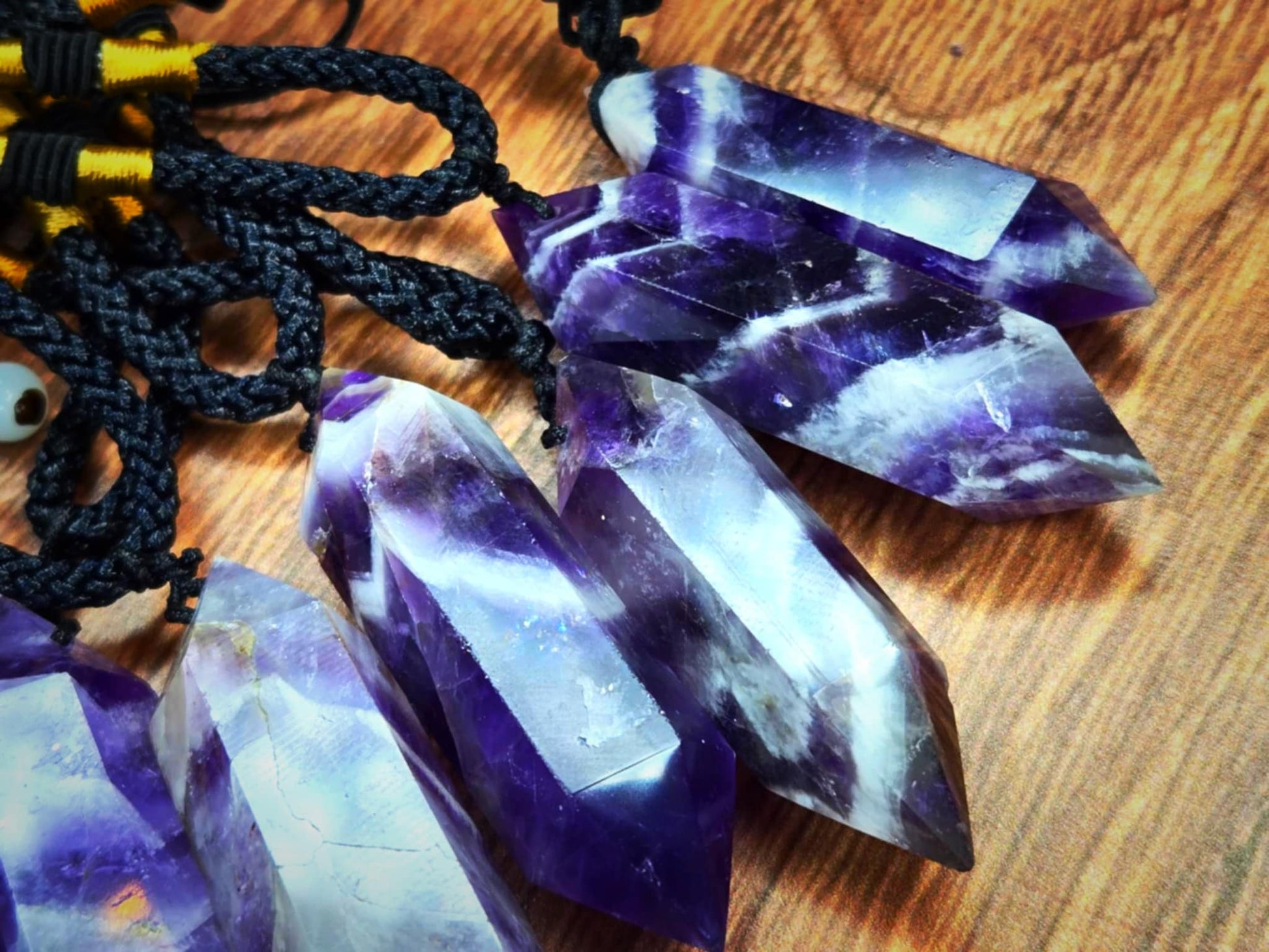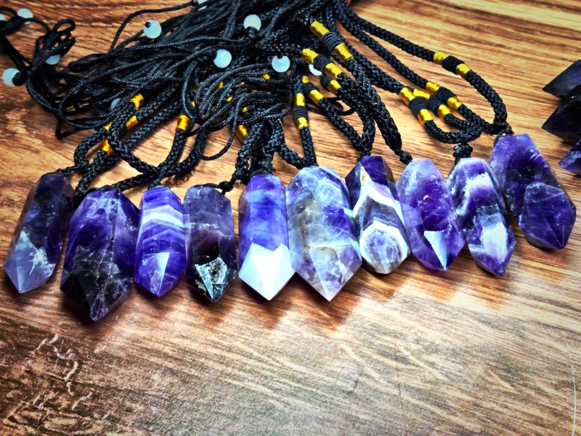 Chevron Amethyst is really a stone of Wholeness. It makes us feel like we are ourselves, but the most elevated version of ourselves. It allows us to benefit from it in so many ways: through physical healing of the body, through emotional regulation and clarity, through mental anguish and struggles, through crises of faith. Chevron Amethyst brings us a sense of being restored; of being complete; of being valid on all levels. It is a stone that reminds us of our own power, strength, resilience and capability. Add the spellwork to it and it's a solid combination of energies that will carry you through. These come on the cord as shown.