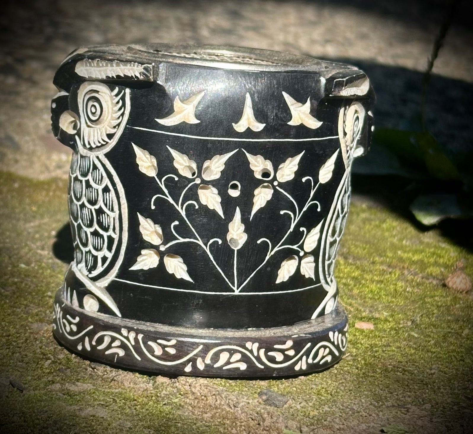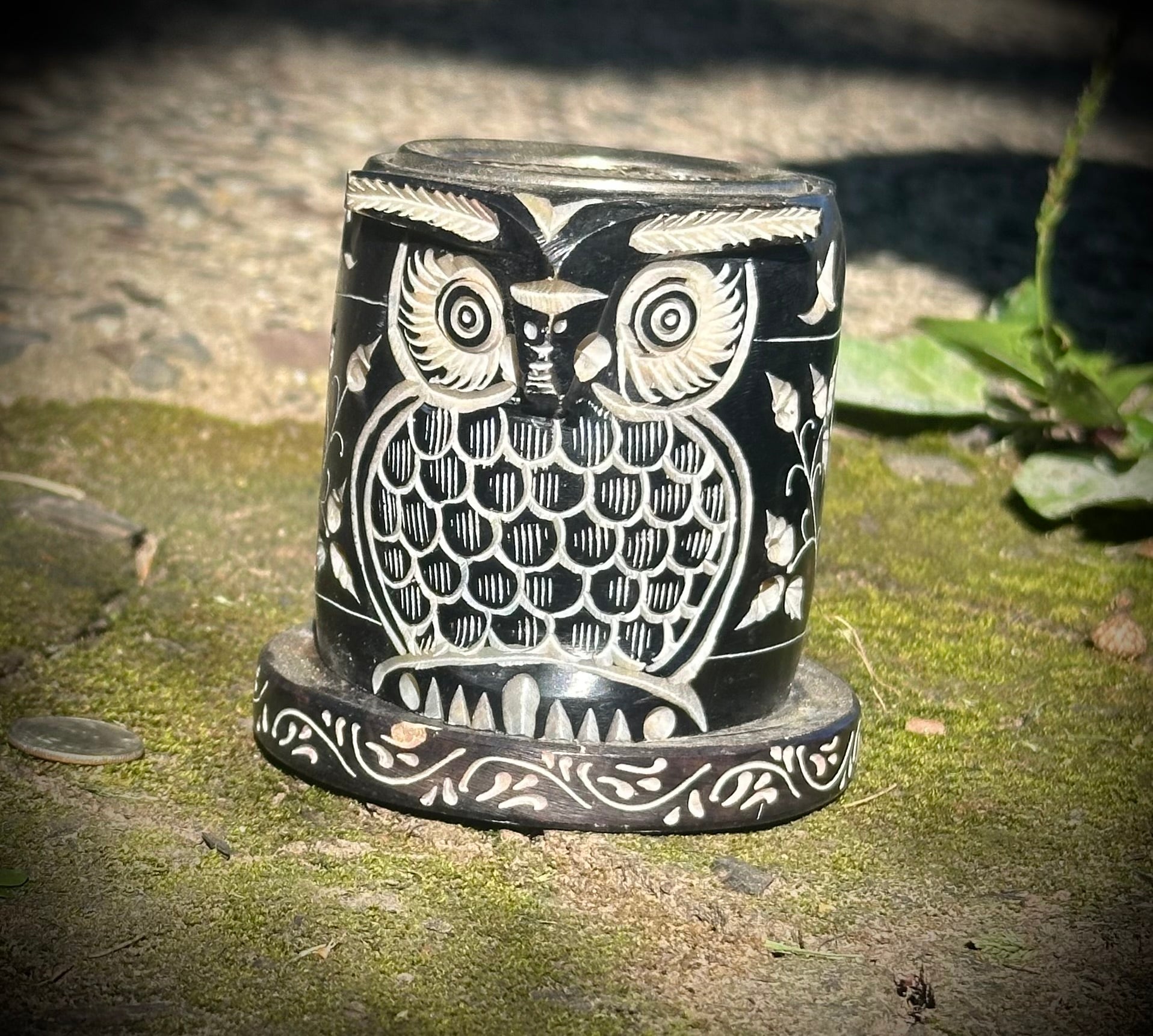 the Owl is perfectly suited for cone incense. It is placed inside and the smoke wafts beautifully up through the caged top.