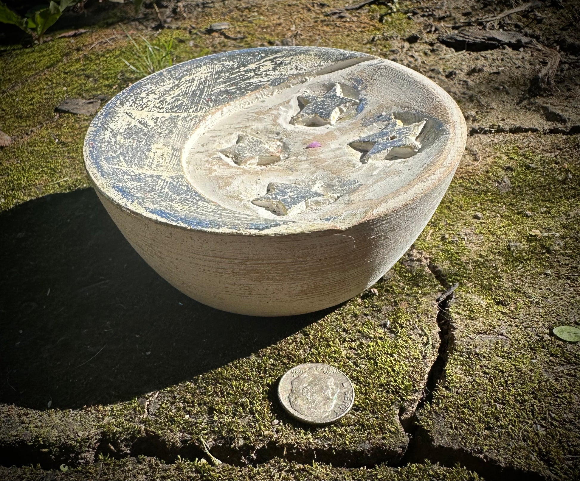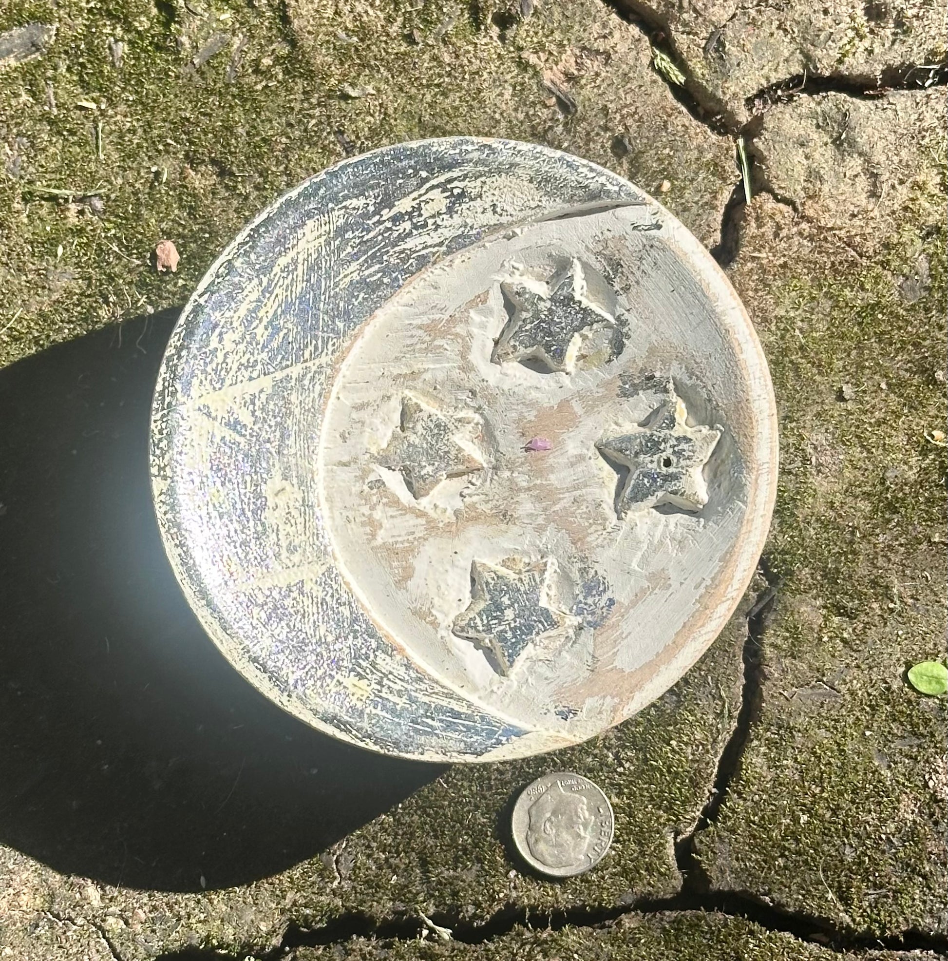 the Moon and Stars was sent out in our first ever Witchy Subscription Box and we’ve cherished it for that reason ever since. It is made of wood with silver and white paint.