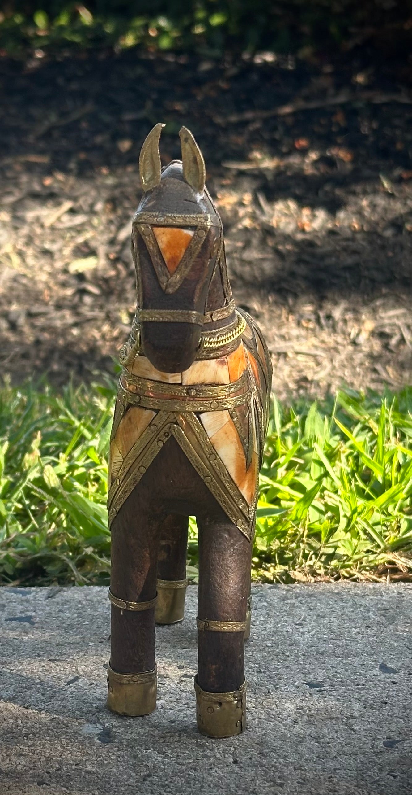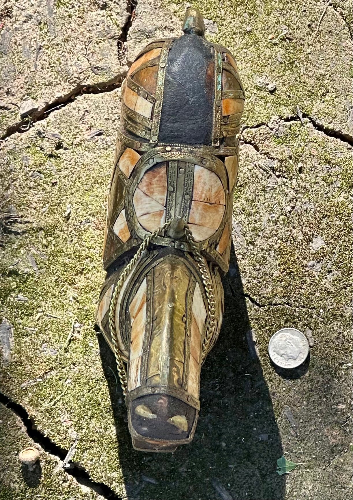 This baby is wooden with hammered brass and copper inlays and shell. It has been in a multitude of spellwork including protection and prosperity. It is here to draw forth abundance, safety and regal energy into your world.