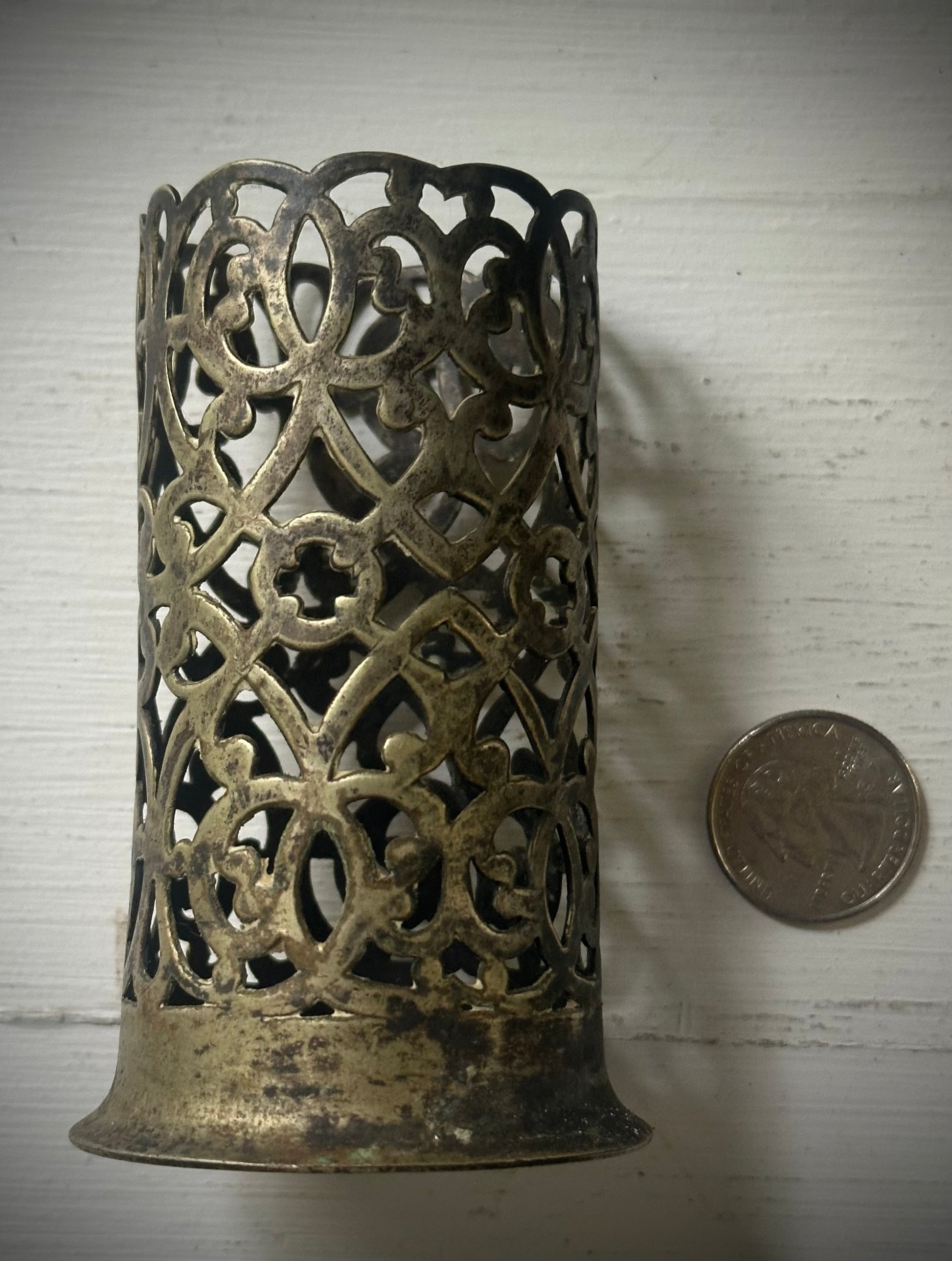 This lovely antique piece is perfect for a chime candle or even an incense cone. It is made of beautiful metal filigree and it casts a lovely shadow when a candle is in it.