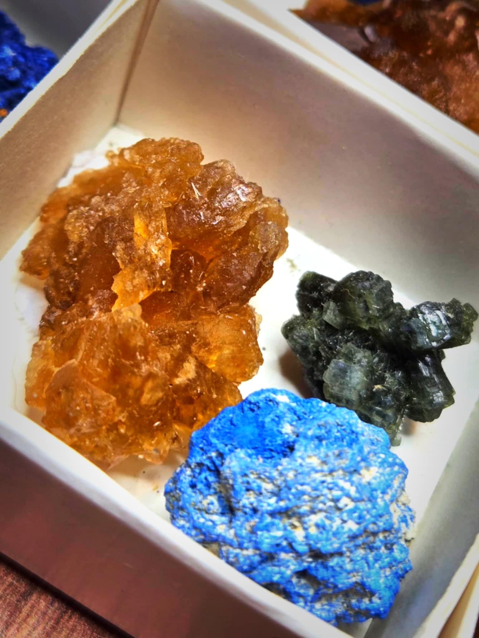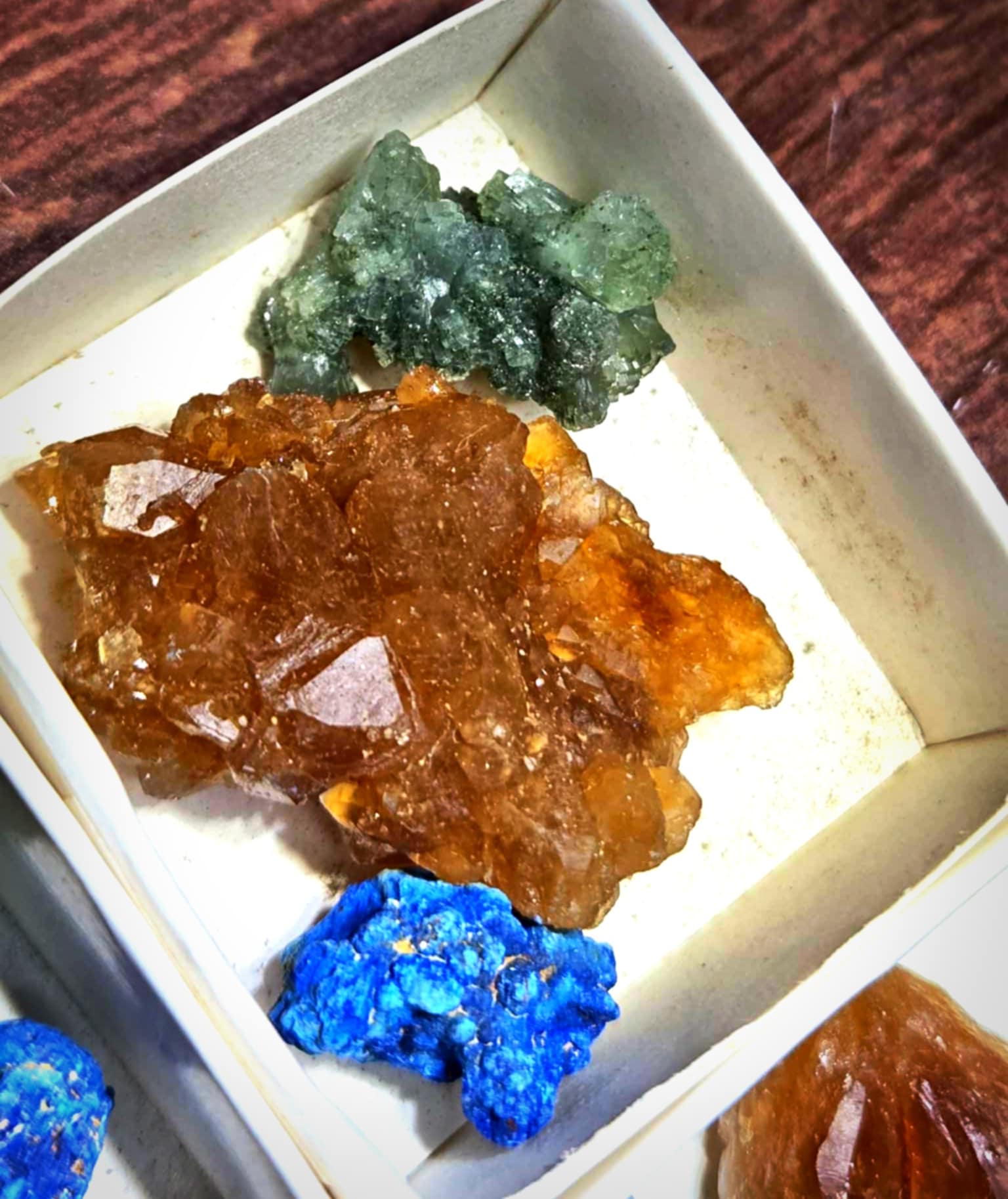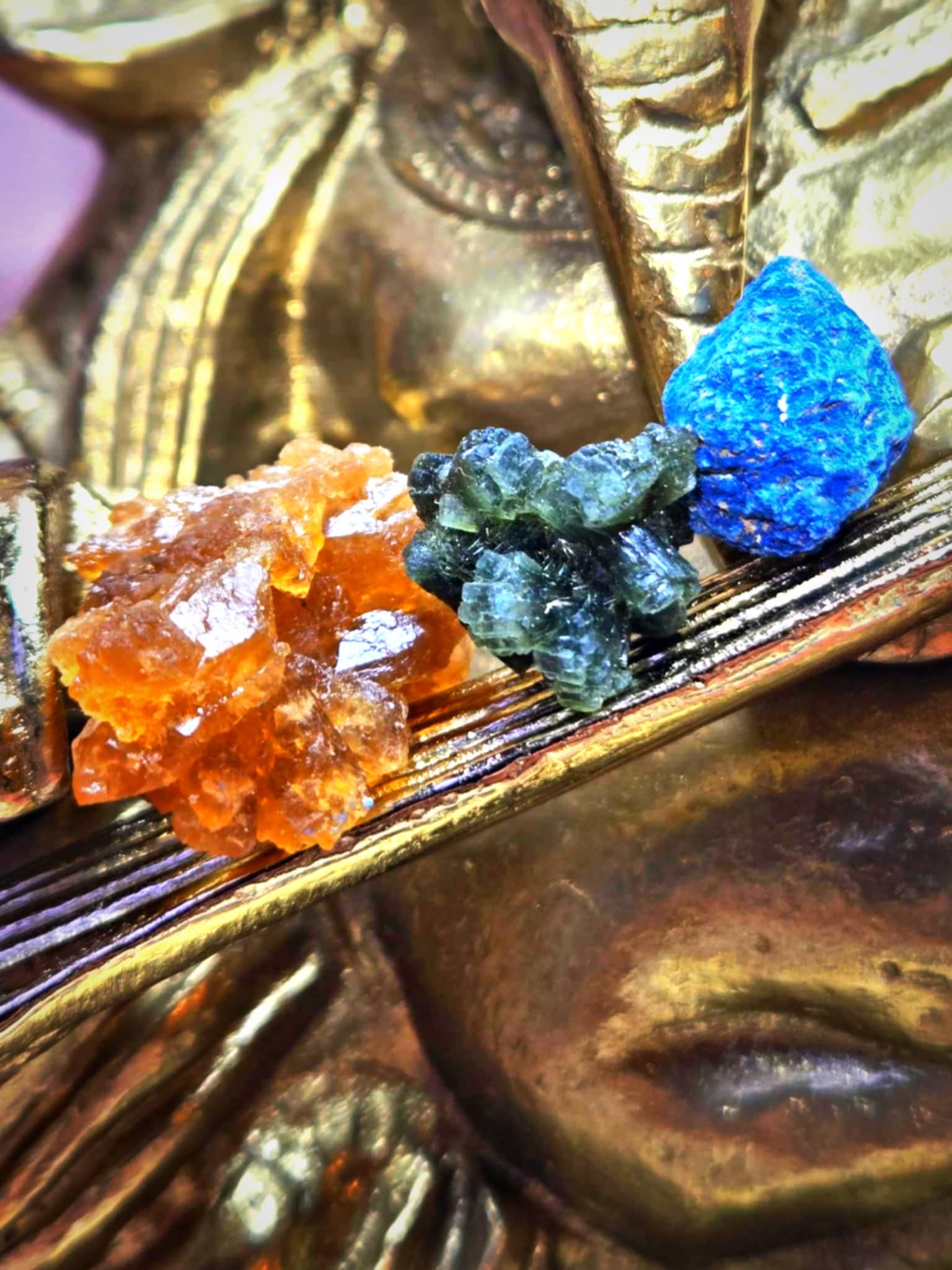 This bundle of these tiny specimen pieces is out of this world and has been hand curated by us. We have a combination of authentic Moroccan Natural Citrine, Azurite Berries and Prehnite Clusters. Each of these on their own in bigger sizes would be out of this world expensive but grouped together in these smaller sized showpieces we can make them accessible to you. Azurite allows you to align with your intuition, your higher self, your spiritual path and it brings such an abundance of good energy. Citrine is the perfect crystal for a Road Opening spell and it infuses everything with the most positive, happy and lucky energy there is. Prehnite brings you inner calm, peace, and is said to have psychic and prophetic properties. This combination is so great for clearing the path to a deep inner knowing stacked with motivation to move forward. Specimen pieces are designed to be tiny little pieces of magic, each one is like a little world and they deserve to be seen, appreciated and valued.