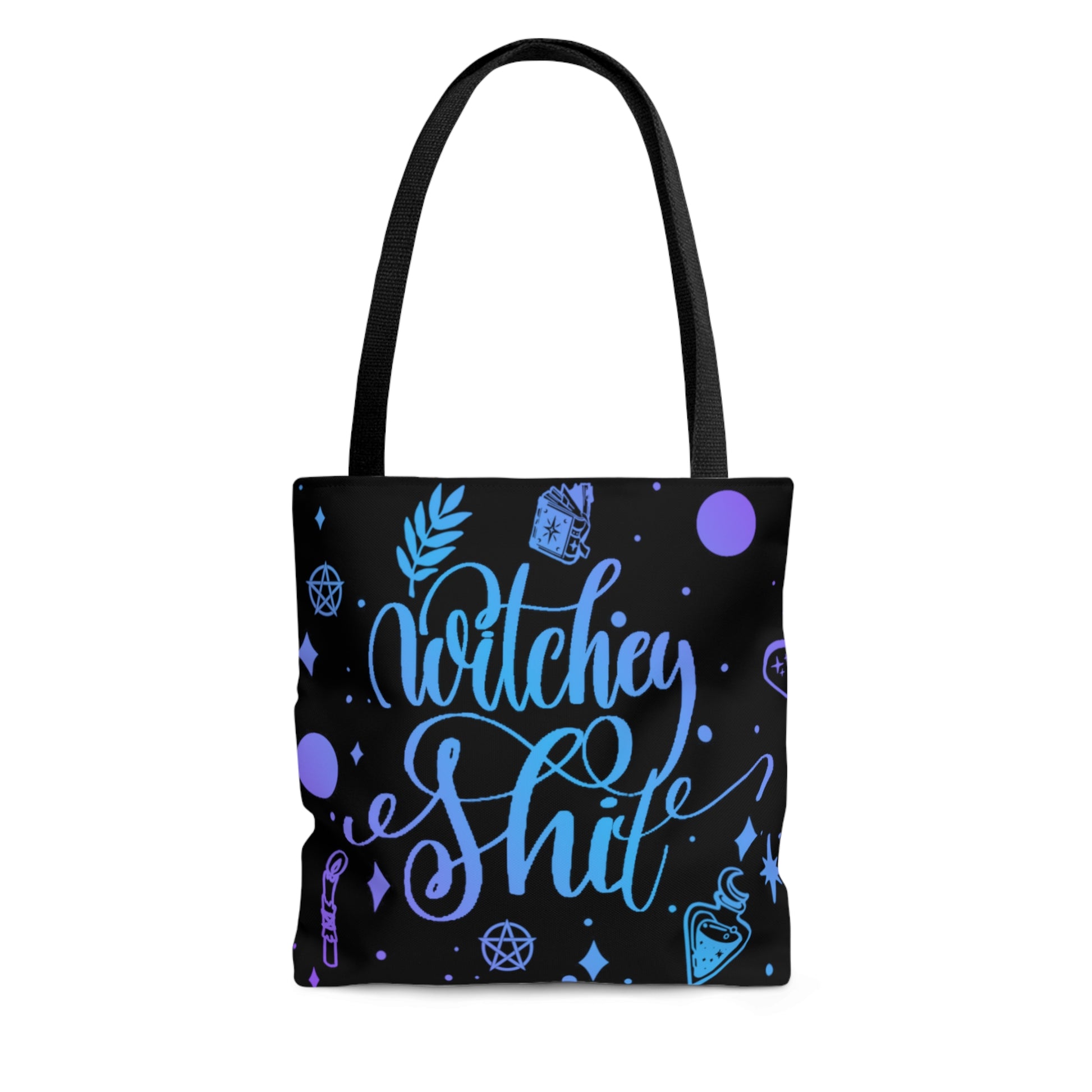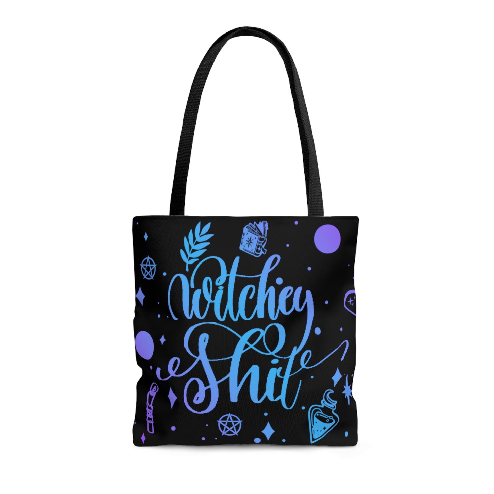 The tote bag is available in three sizes, so you can choose the perfect one for your needs. So if you're looking for a stylish and practical way to transport your witchy supplies, look no further than the Moonstone Witchery Witchy Shit Tote Bag!